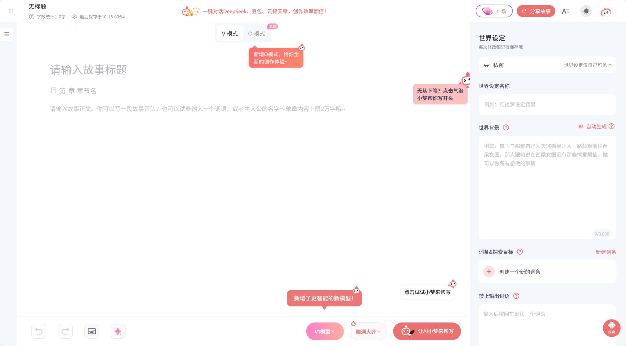 亮点:字节跳动旗下,免费;对话式交互,可随时“@角色”让AI扮演反派或女主即兴对戏,帮作者把台词练得更口语化。
