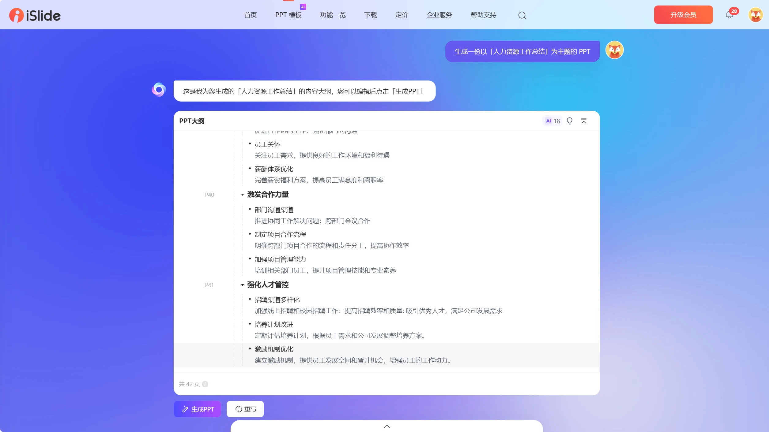 一键生成PPT,用户只需输入标题或主题,AI技术就能自动生成完整的PPT演示文稿,大大节省了用户的时间