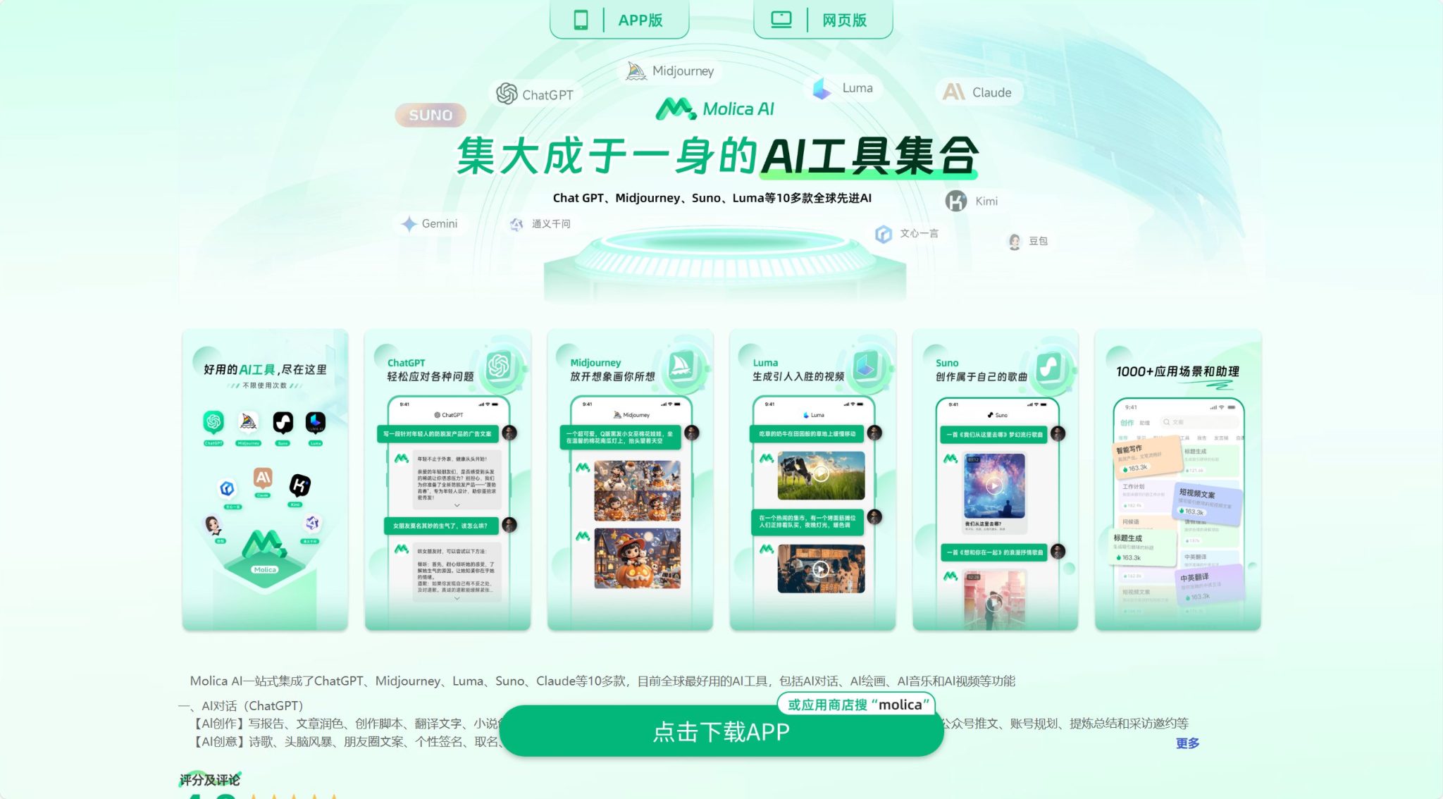 集大成于一身的AI工具合集。包含ChatGPT、Midjourney、Suno、Luma、Claude、Gemini、Kimi、豆包、通义千问、文小言等,全球10多款先进的AI工具
