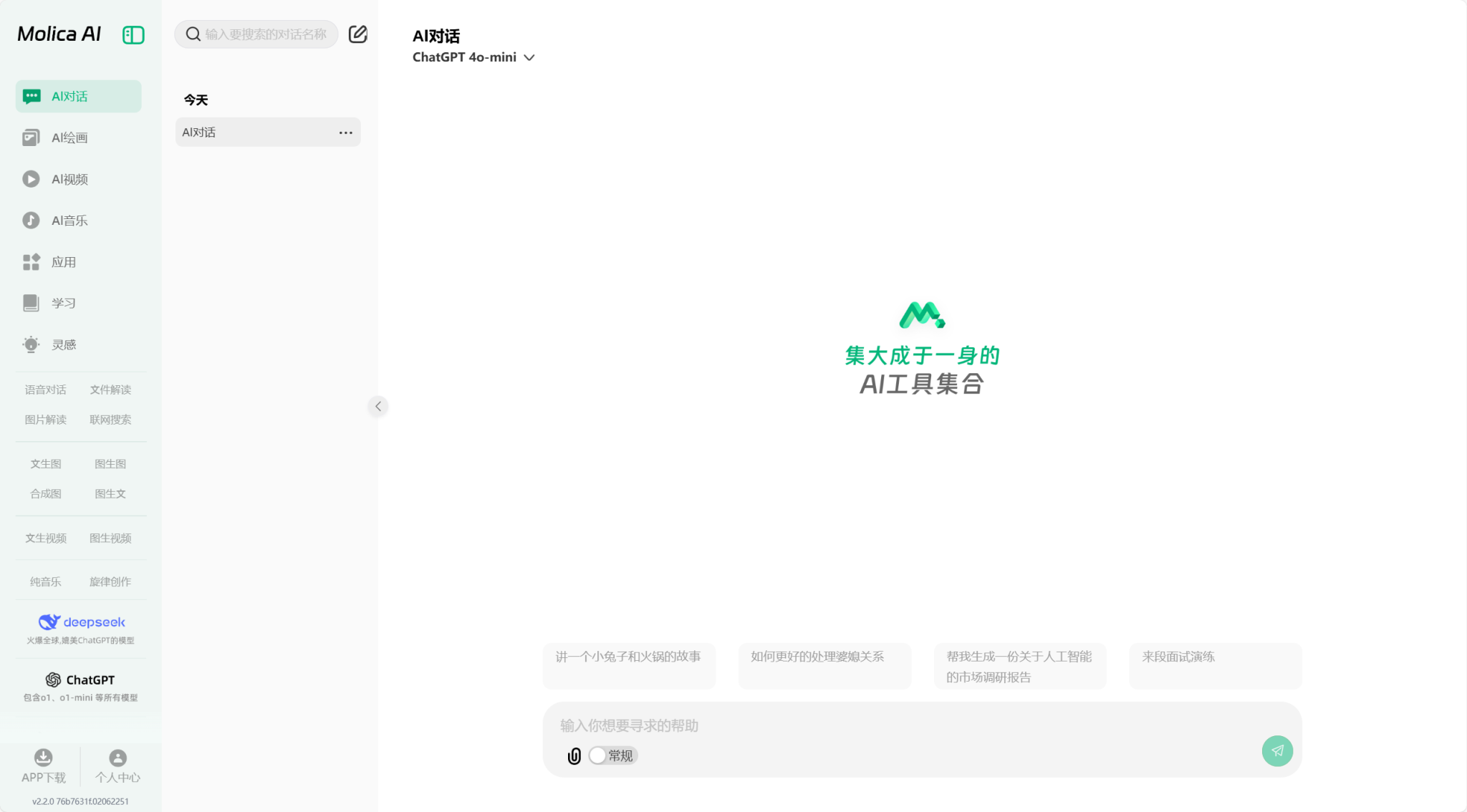 集大成于一身的AI工具合集。包含ChatGPT、Midjourney、Suno、Luma、Claude、Gemini、Kimi、豆包、通义千问、文小言等,全球10多款先进的AI工具。登录免费送100灵力的额度。