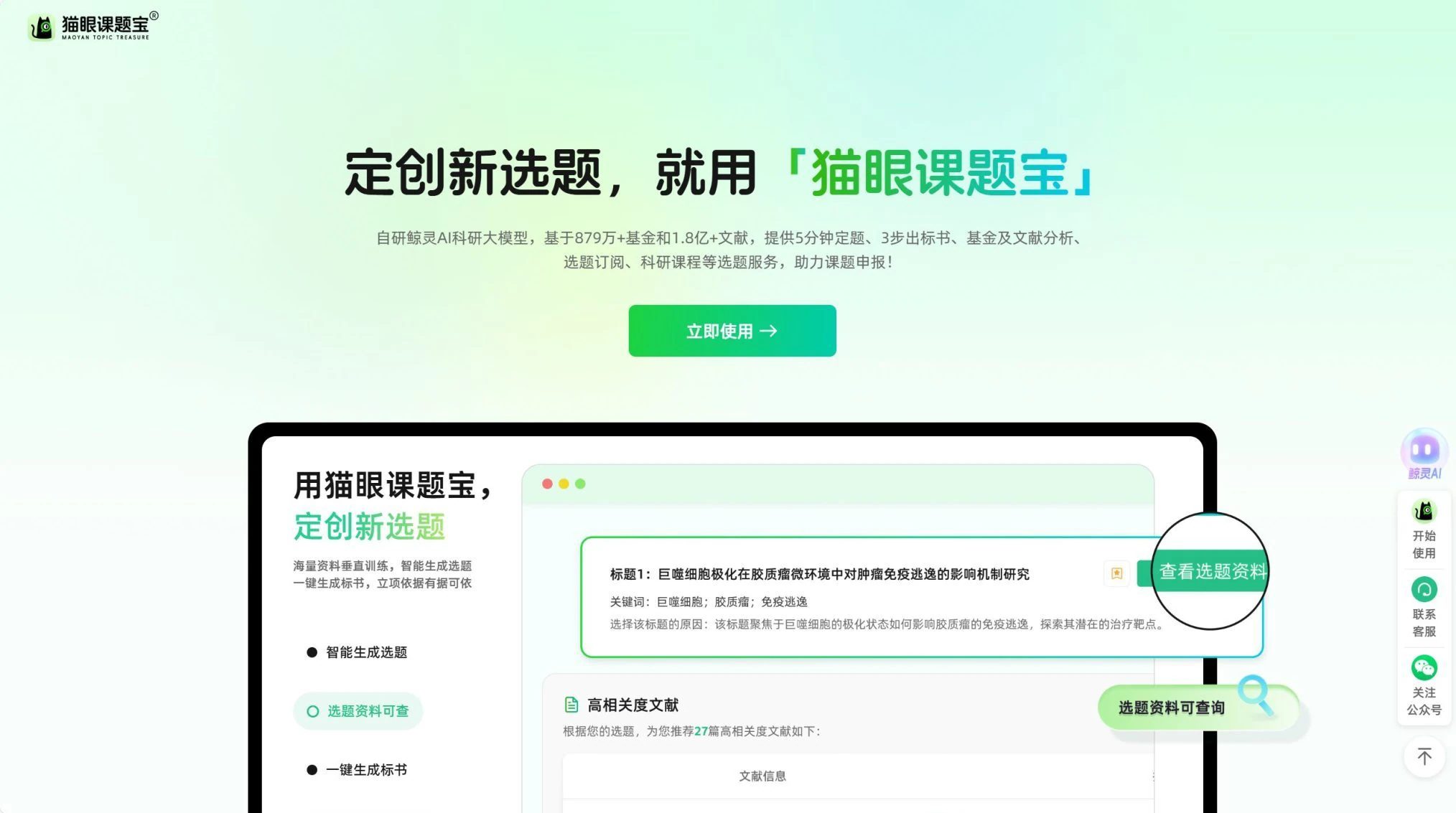 一款令高校老师爱不释手的“利器”,它能在5分钟的时间内为你定制出一份满意的创新选题,并通过3步的高效流程为你生成一份高质量的标书,还能为你内置10万+的课题数据库,并自动匹配相关的参考文献。